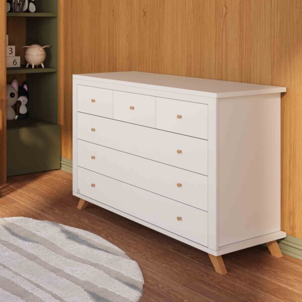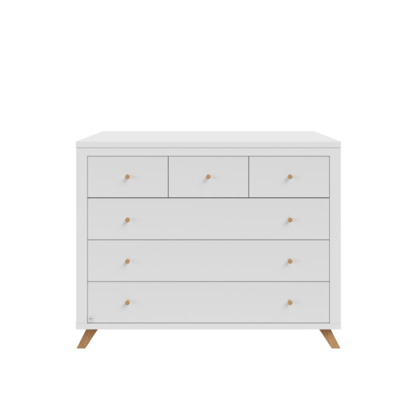 שידת אוונטדור מתאימה למי שמחפש שידה קלאסית, פונקציונלית וחלוקה מדויקת של מגירות – 3 קטנות לאחסון חפצים קטנים ו- 3 מגירות גדולות לאחסון בגדים. היא מגיעה עם פינות מעוגלות בפלטה עליונה ובפלטה התחתונה לשמירה על סביבה בטוחה לתינוק.