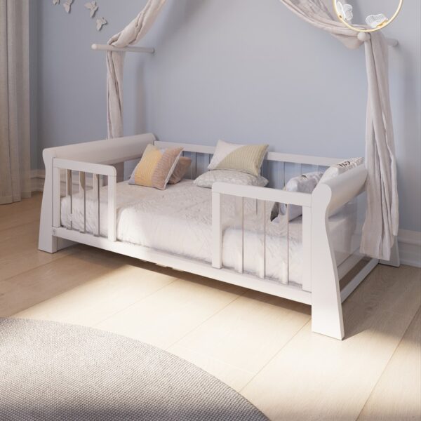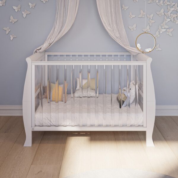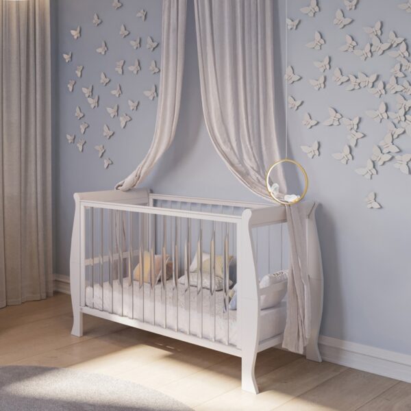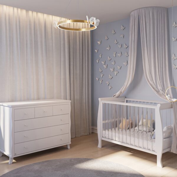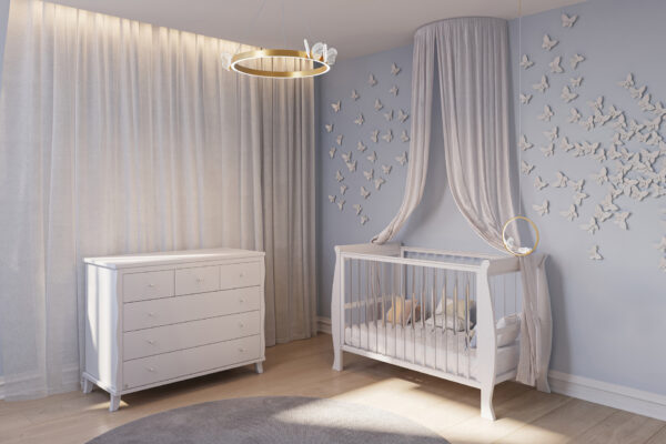 המיטה מעוצבת בקווים קלאסיים מעוגלים, עשויה מחומרים איכותיים במיוחד, ומעניקה לחדר התינוק מראה יוקרתי, נקי ומרגיע.