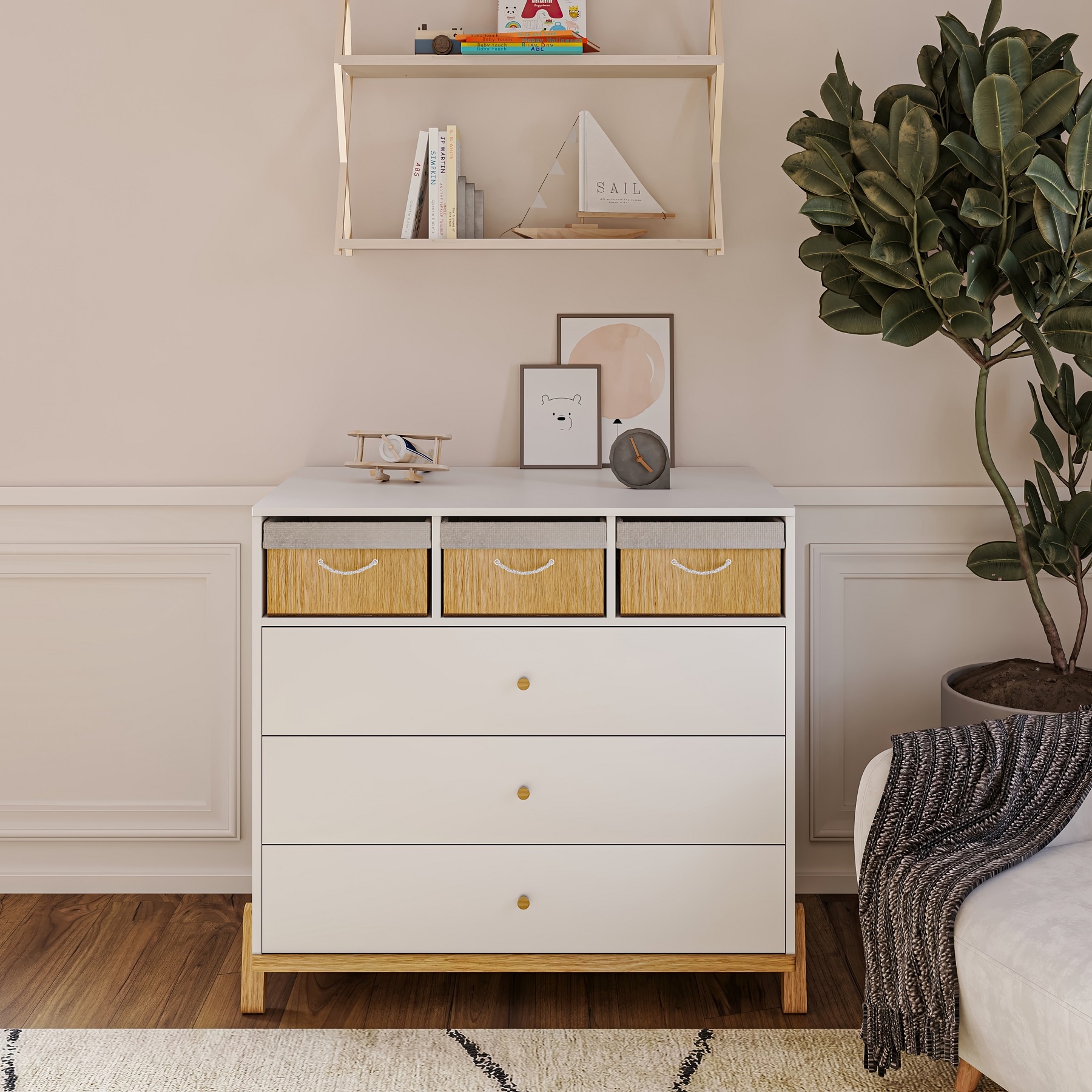 שידה ליסבון מאובזרת במסילות נסתרות טריקה שקטה אוטומטיות ורגליים מעוצבות עשויות עץ בוק מלא הגוון הלבן בשילוב במה בגוון עץ טבעי ורגליי בוק מעניק לה מראה חדיש ומיוחד.השידה מאובזרת ב3 סלסלות ו3 מגירות מרווחות.