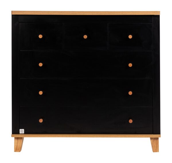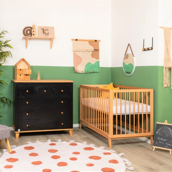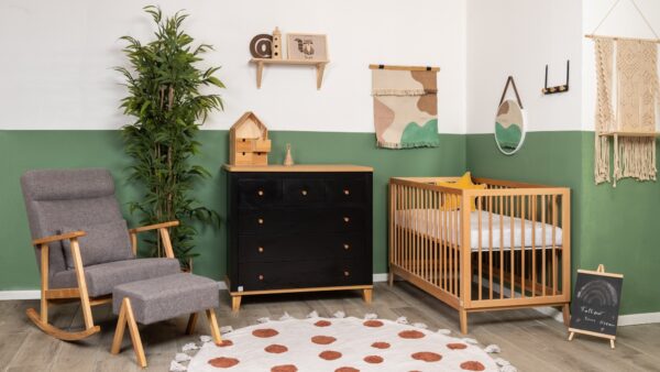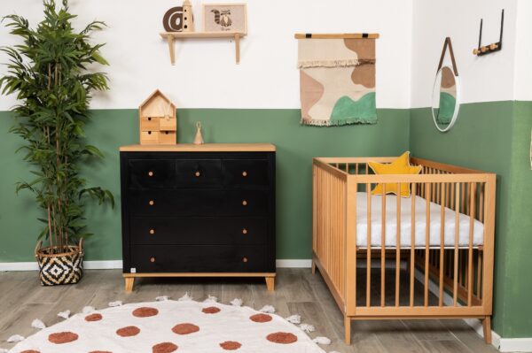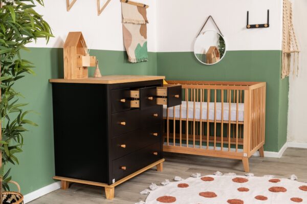 השידה המהממת משלבת גוון שחוק ועץ טבעי, בעלת קווים מודרניים וחלוקת מגירות פרקטית – 3 קטנות ו-3 גדולות. מיטת תינוק וויני מציעה מראה עכשווי ומרשים, משדרגת כל חלל ומכניסה עיצוב שיקי. המיטה מגיעה בגוון עץ בוק, עם בסיס במה עץ בזווית המגביהות אותה ומעניקות לה מראה קליל. בסיס המיטה מתכוונן ל- 4 מצבי גובה וברגי המיטה פנימיים ואינם נראים לעין. שניר בייבי מקפידה על ייצור איכותי ומוקפד, תוך דגש על חומרי גלם איכותיים ובטיחות מעל הכל.