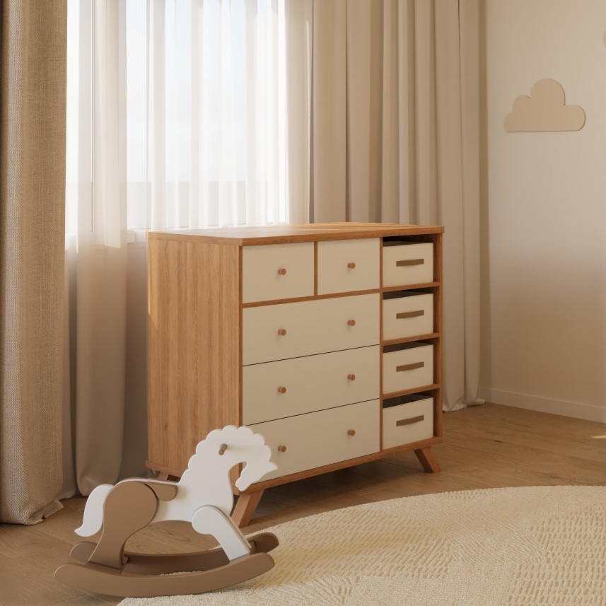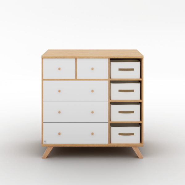 שידה סלי משלבת עץ טבעי וגימור לבן, וכוללת שילוב ייחודי של מגירות קלאסיות לצד תאי אחסון עם סלסלות בד.