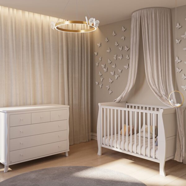 המיטה מעוצבת בקווים קלאסיים מעוגלים, עשויה מחומרים איכותיים במיוחד, ומעניקה לחדר התינוק מראה יוקרתי, נקי ומרגיע.