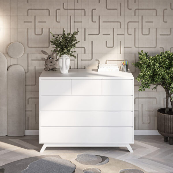 שידת בייג׳ין מעוצבת בצורה קלאסית, עם 6 מגירות מרווחות ( 3 גדולות ו- 3 קטנות), עם מסילות טריקה שקטה ובשילוב בטיחות גבוהה לתינוק. הבמה שלה עשויה מעץ מלא והידיות איטגראליות ונוחות לשימוש.
