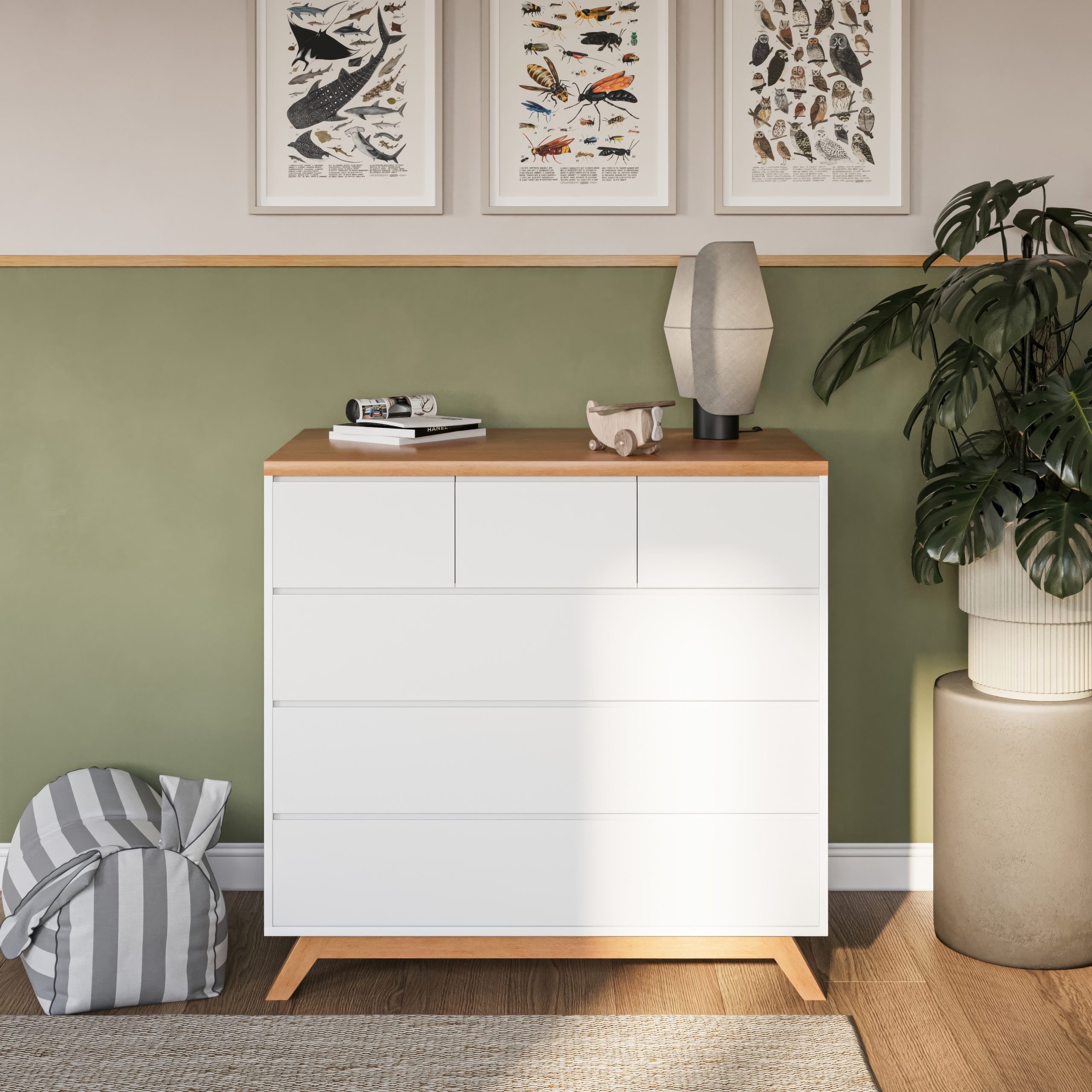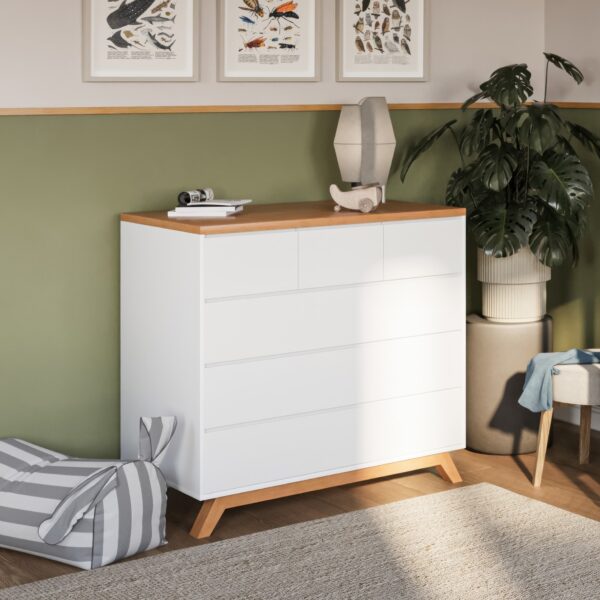 שידה דונגוואן מביאה משב רוח מרענן, עם עיצוב קלאסי, טריקה שקטה, פונקציונאליות גבוהה וחלוקה סופק נוחה של 3 מגירות קטנות ו- 3 גדולות. השידה מגיעה עם במה מעוצבת ובטיחותית לתינוק ושילוב מדהים של גוון עץ ולבן