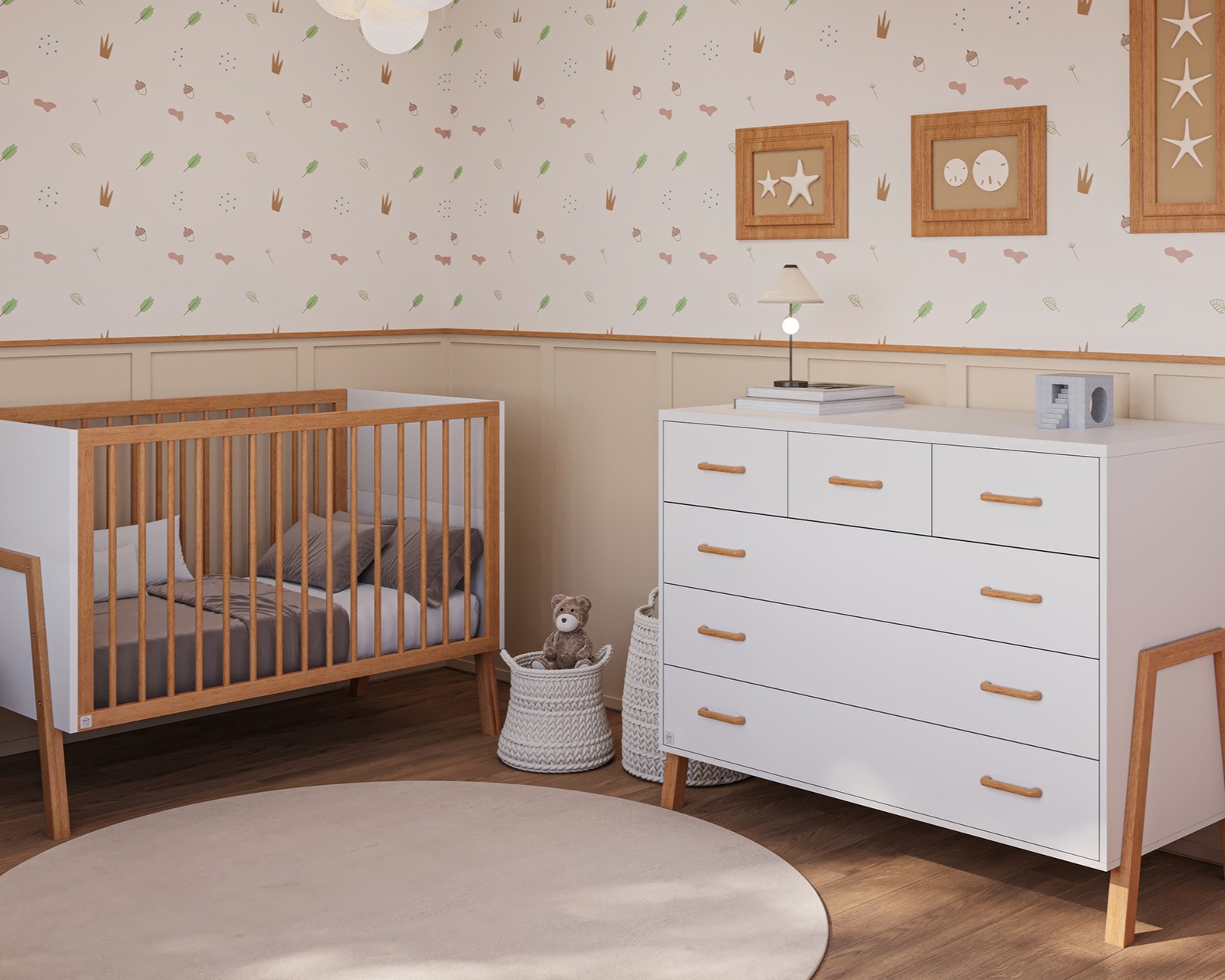 שידה מרסי החדשה מעוצבת בקו נקי, מודרני וחמים, בגוון לבן משולב ידיות ורגליים בגוון עץ טבעי. מעניקים לחדר התינוק מראה יוקרתי, רגוע ונעים.