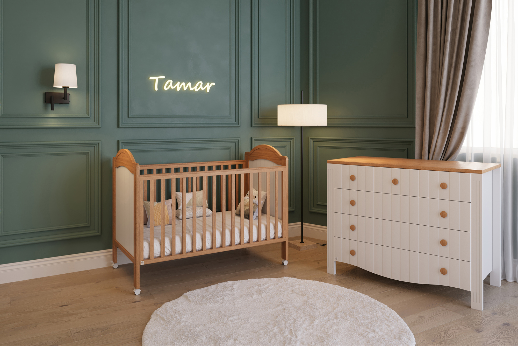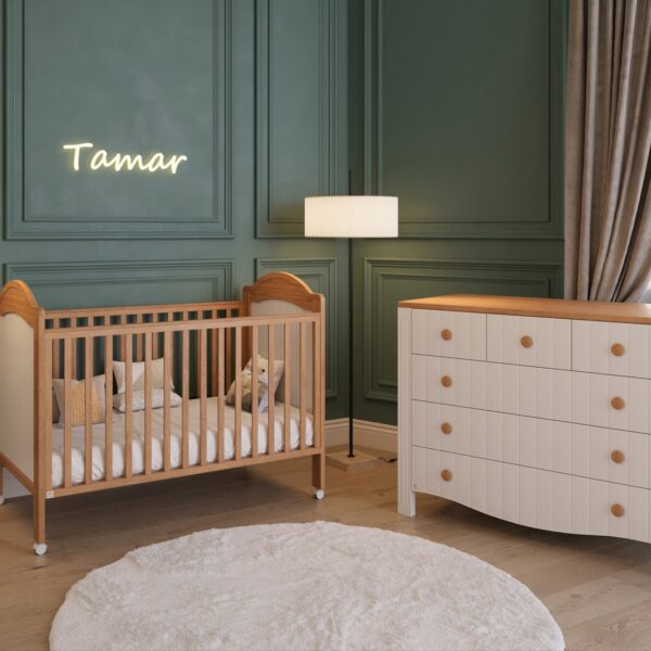 מיטה בעיצוב תמר נבנתה בקו תואם לשידה — שילוב של עץ טבעי עם אלמנטים בלבן נקי, יחד עם פרופורציות מדויקות ובטיחות גבוהה.. שניר בייבי מקפידה על סטנדרטים גבוהים של איכות החומרים, יחד עם שירות מצוין וזמינות לכל שאלה.