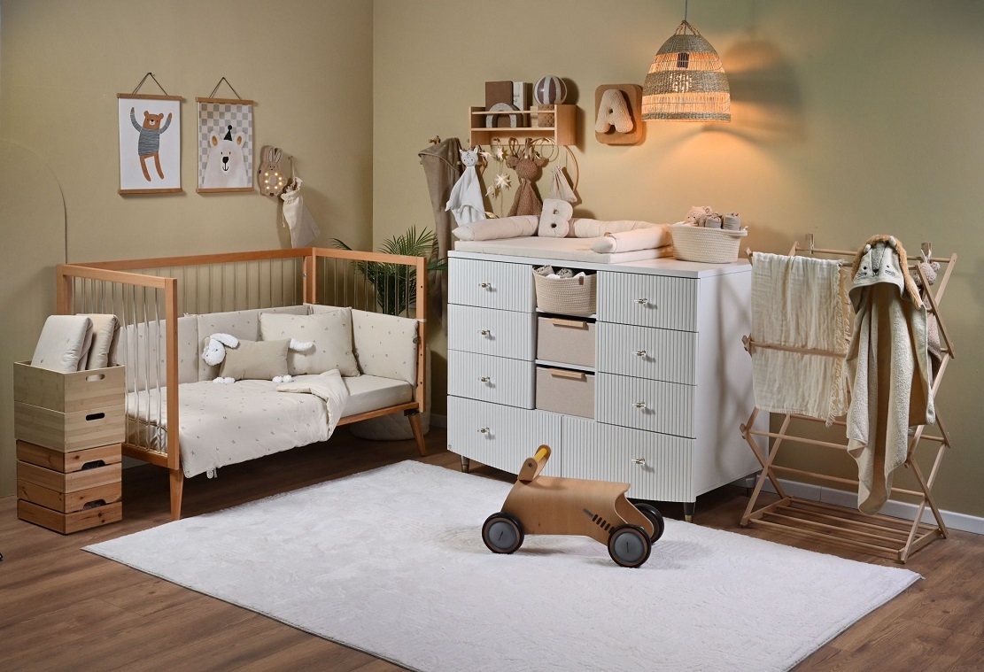 שטיח באפלה שמנת מוסיף סטייל יוקרתי לחדר התינוק.