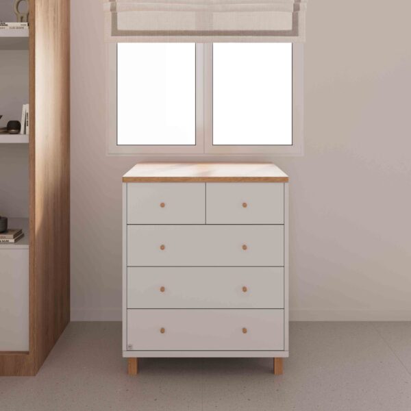 שידה קלאסית עם פינות מעוגלות בפלטה עליונה ובפלטה התחתונה לשמירה לסביבה בטוחה לתינוק וחלוקת מגירות 2 קטנות ו3 גדולות. עם משטח עליון בעומק 60 ס"מ ורגליים העשויות מעץ מלא חזק ועמיד לשנים. בשידה זאת מותקנות מסילות טלסקופיות איכותיות בעלות כושר נשיאה גובה