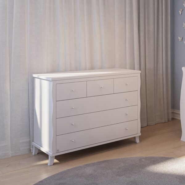 שידת ויקטורי לבן אקרילי מתאימה למי שמחפש שידה קלאסית, פונקציונלית וחלוקה מדויקת של מגירות – 3 קטנות לאחסון חפצים קטנים ו- 3 מגירות גדולות לאחסון בגדים. היא מגיעה עם פינות מעוגלות בפלטה עליונה ובפלטה התחתונה לשמירה על סביבה בטוחה לתינוק.