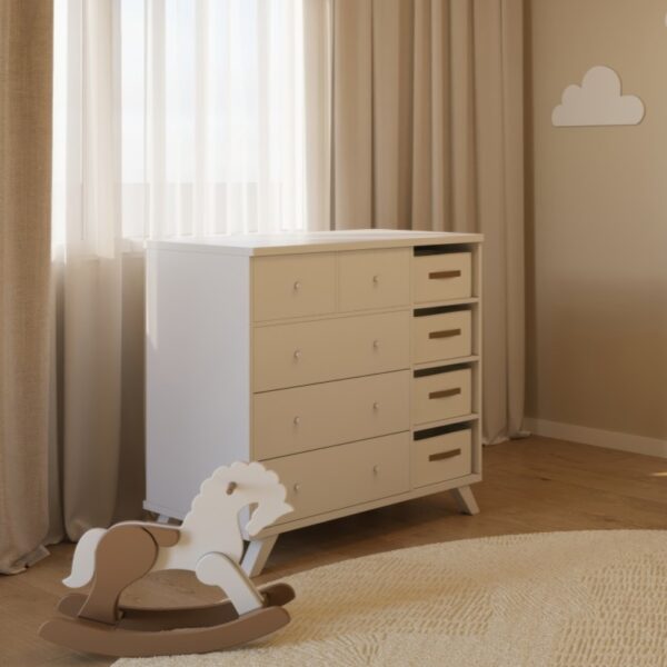 היא משלבת גוף עץ בגוון טבעי, חזיתות מגירות בצבע לבן רך וארבעה תאי אחסון פתוחים הכוללים סלסלות בד נשלפות עם ידיות בד איכותיות.