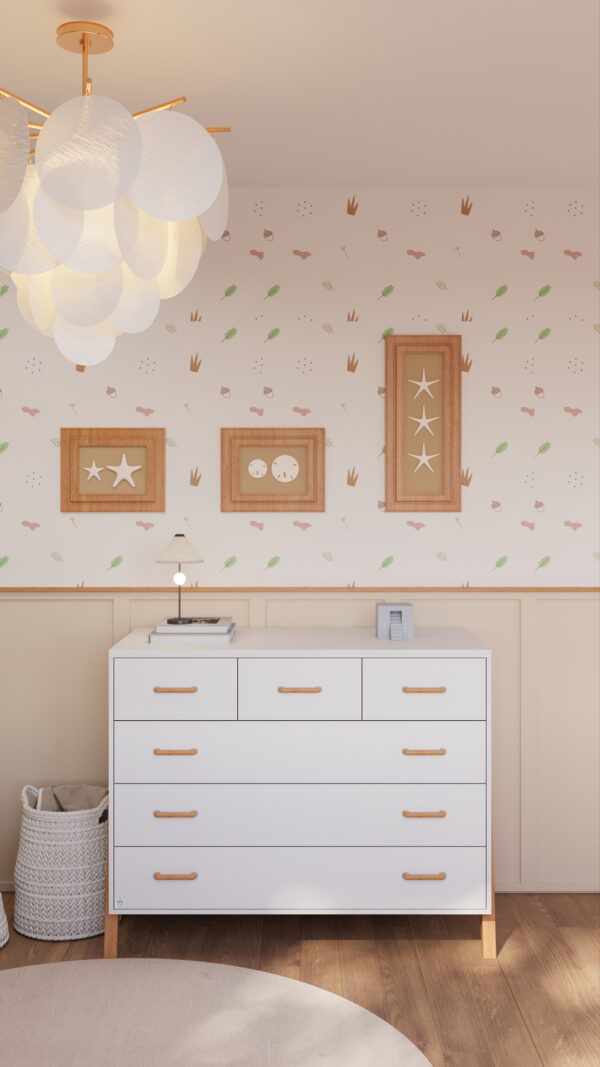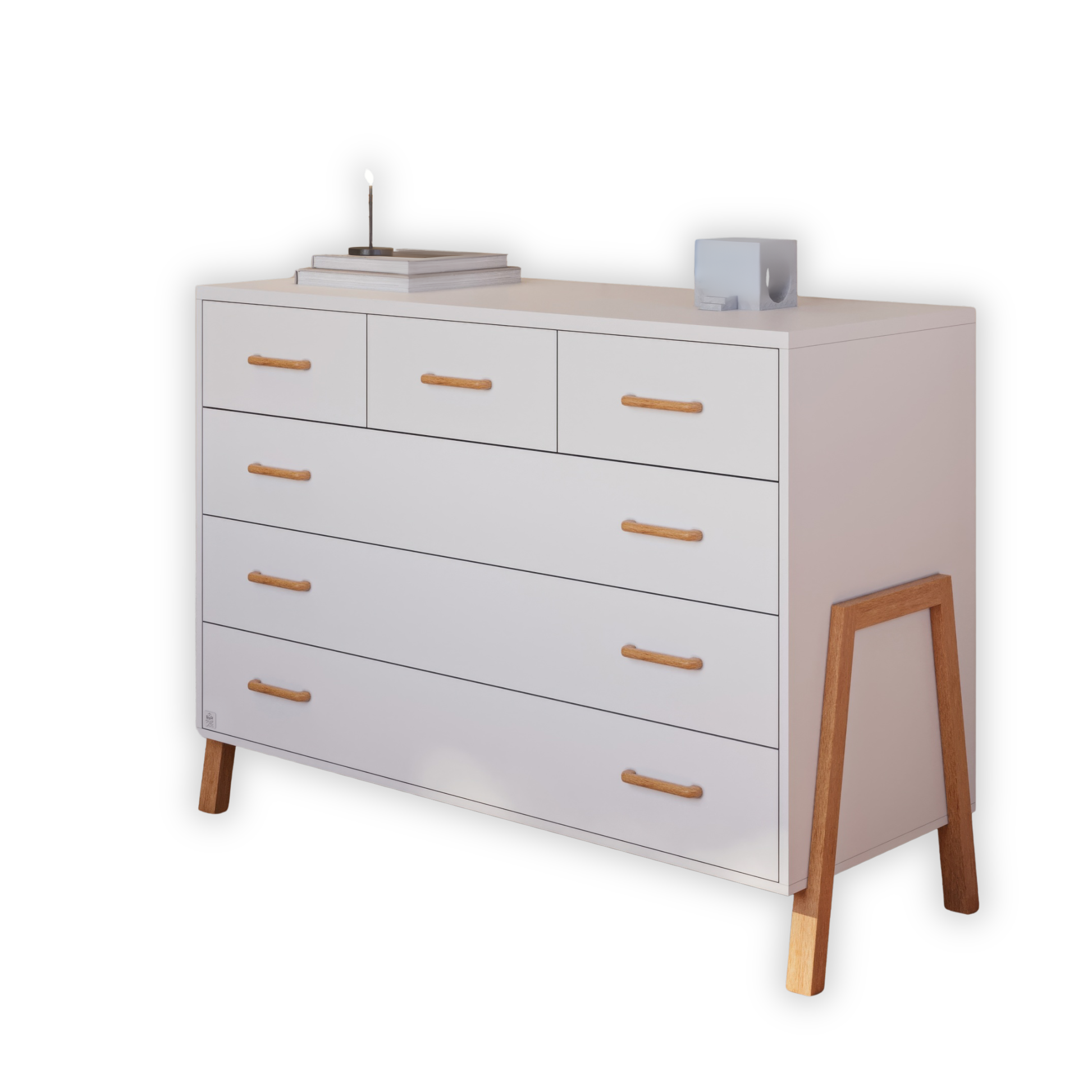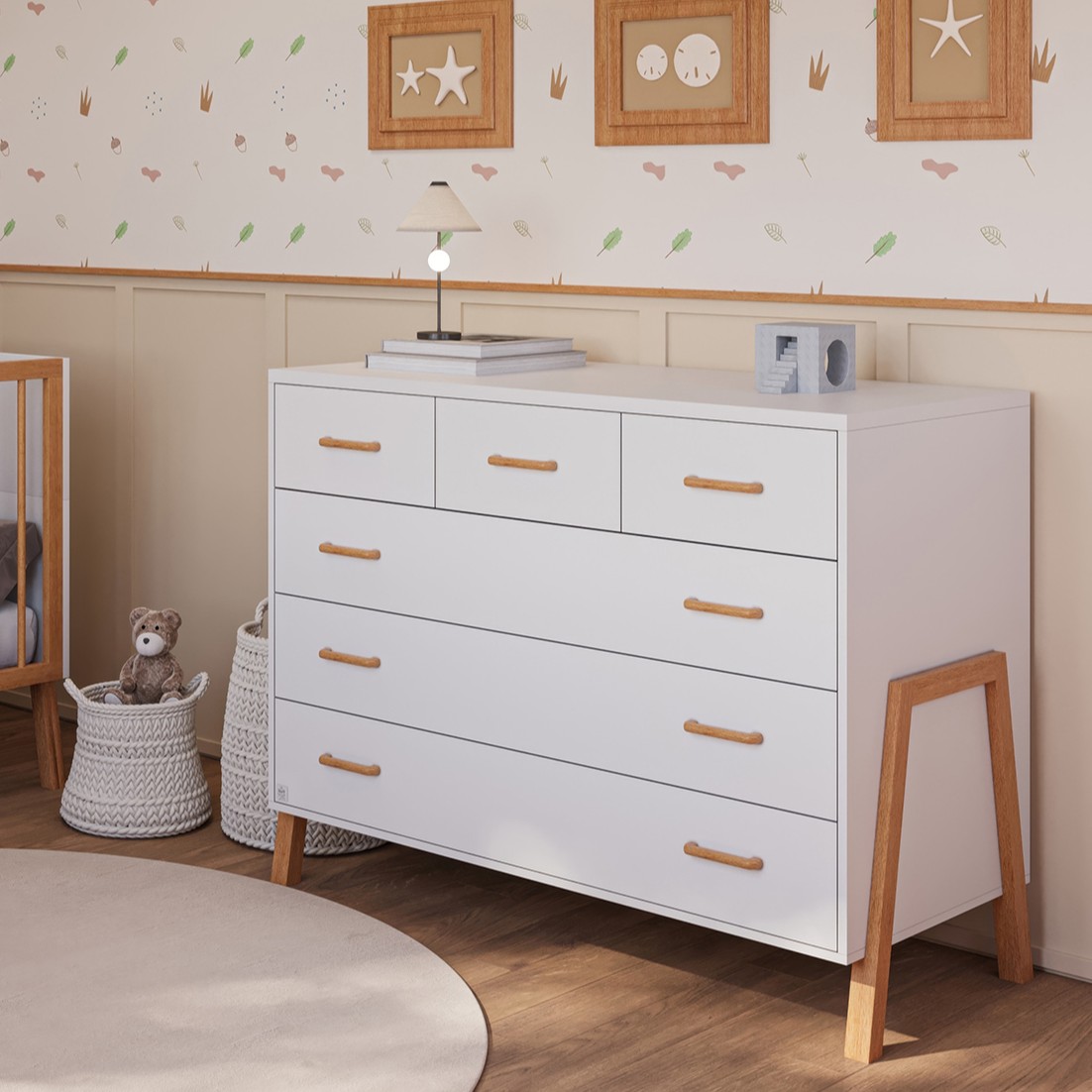 השידה מעוצבת בקו נקי, מודרני וחמים, בגוון לבן משולב ידיות ורגליים בגוון עץ טבעי שמעניקים לחדר התינוק מראה יוקרתי, רגוע ונעים.