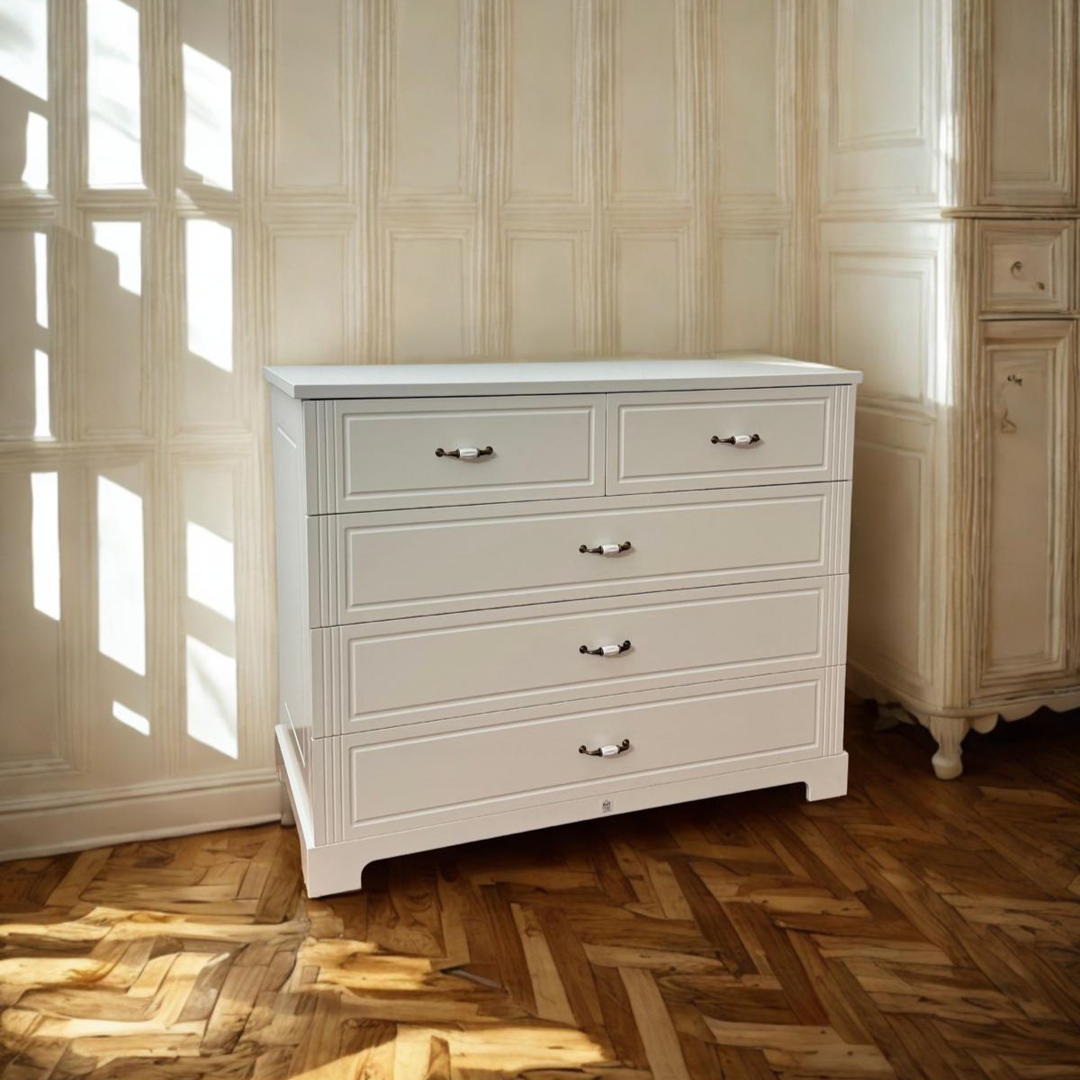 השידה פרינסס היא יצירת עיצוב קלאסית בסגנון וינטג’ מפואר, עם נוכחות אלגנטית שמוסיפה אצילות לכל חדר תינוק. הקווים המדויקים, החריטות העדינות והגימור היוקרתי בצביעה בחדר תנור מעניקים לשידה מראה מרשים וייחודי שאי אפשר להתעלם ממנו. ידיות הברונזה המעוצבות משלימות את התחושה העדינה והעל־זמנית, ומתמזגות בהרמוניה עם כל סגנון עיצוב בחדר.